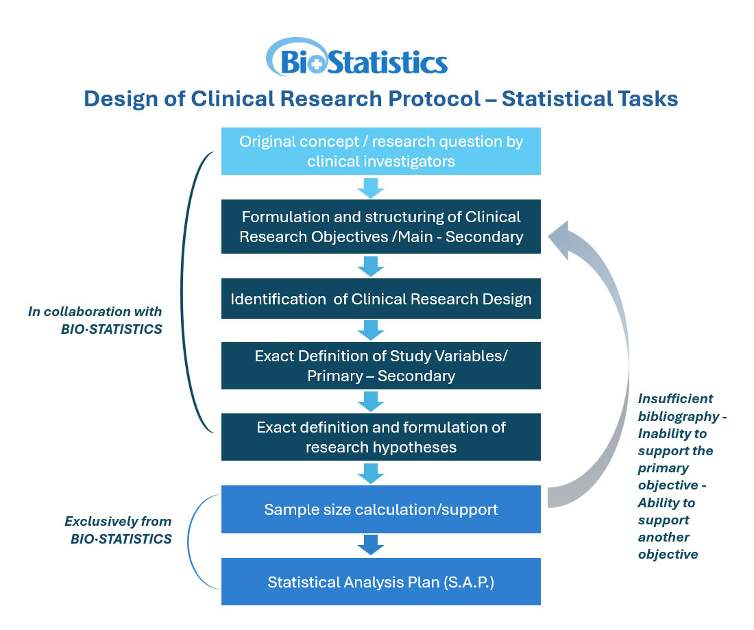 2. Complete design of the study protocol: • Determination of the appropriate statistical study design, depending on study objectives. • Development of the clinical section of the protocol, including literature support. • Development of the administrative/ procedural sections of the protocol. • Development of the statistical sections of the protocol and estimation of the sample size. • Design and formatting the paper CRF.
